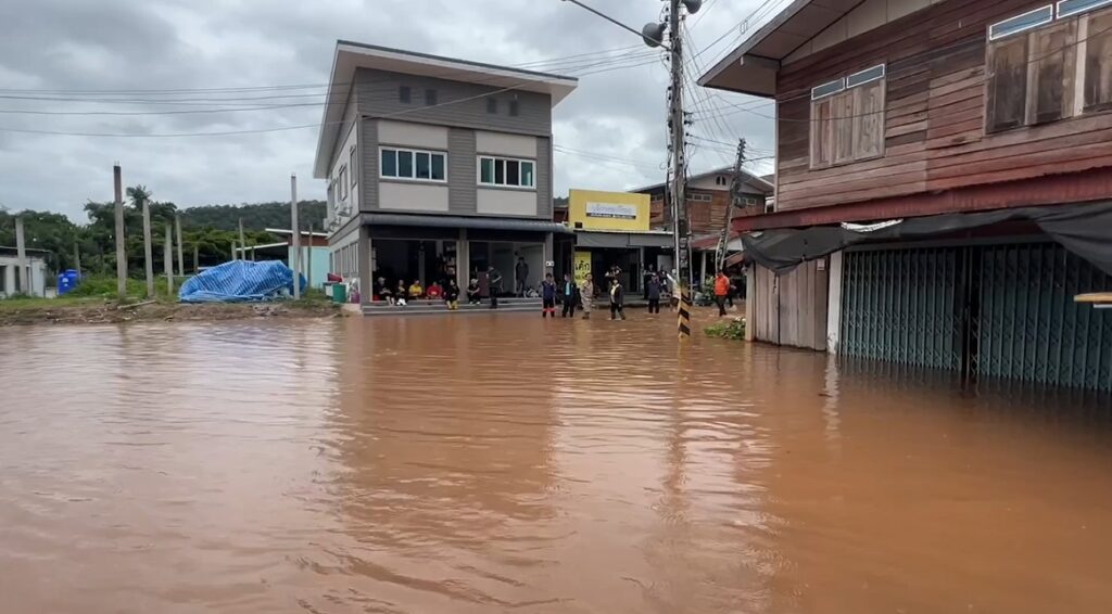27 ส.ค. – ผลกระทบจากพายุ “คาจิกิ” ส่งผลหลายจังหวัดภาคเหนือและภาคอีสาน ฝนตกหนัก อย่าง จ.แม่ฮ่องสอน น้ำป่าไหลหลากอย่างรุนแรงในพื้นที่บ้านแม่โกปี๋ ต.แม่ยวมน้อย อ.ขุนยวม ส่วน จ.เลย แม่น้ำเหืองเอ่อล้นตลิ่งเข้าท่วมบ้านเรือนประชาชน ต.นาแก้ว อ.นาแห้ว ชาวบ้านต้องเร่งยกสิ่งของขึ้นที่สูง