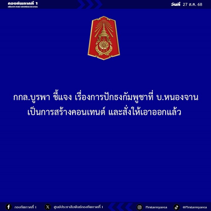 ศปก.ทภ.1 โดย กกล.บูรพา ชี้แจงภาพที่ปรากฏตามสื่อออนไลน์เมื่อวันที่ 26 ส.ค.68 ว่าประชาชนกัมพูชาได้นำธงชาติกัมพูชามาปักเสาธงหน้าแนวลวดหนามพื้นที่บ้านหนองจานนั้น ปัจจุบัน (27 ส.ค.68) จากการตรวจสอบพบว่าประชาชนกัมพูชา ได้นำธงดังกล่าวออกไป และทหารกัมพูชาได้ห้ามปรามการกระทำดังกล่าวเรียบร้อยแล้ว คาดว่าการดำเนินการดังกล่าว เป็นการทำคอนเทนต์เพื่อลงสื่อออนไลน์ และนำลงไปเรียบร้อยแล้ว -สำนักข่าวไทย
