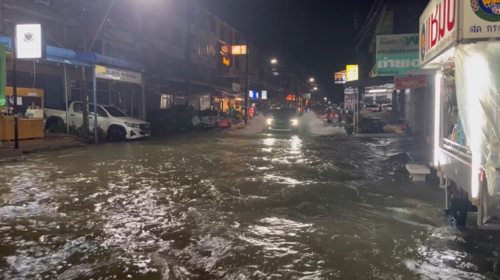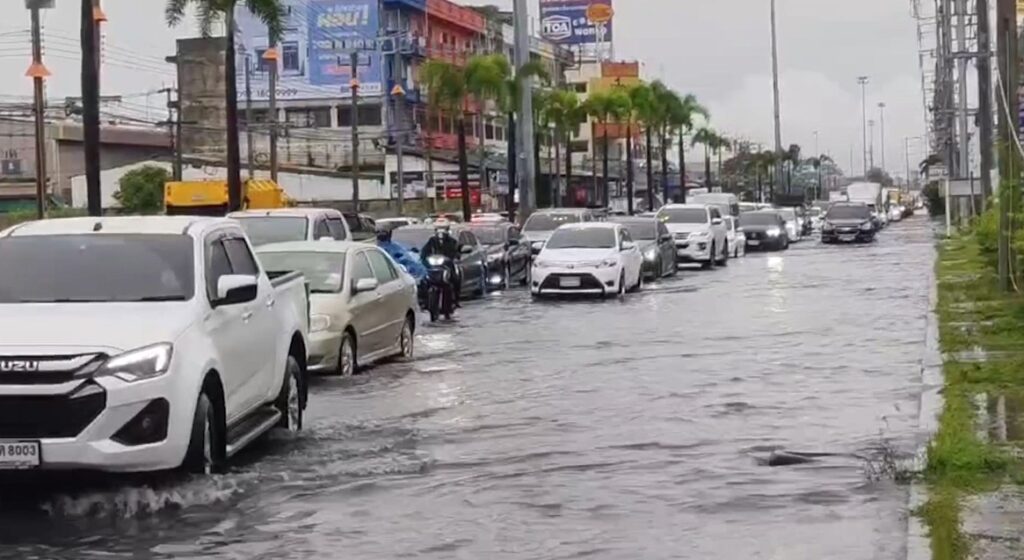 ส่วนในเขตพื้นที่เมืองพัทยา เกิดฝนตกหนักไม่ถึง 1 ชั่วโมง แต่หลายพื้นที่ของเมืองพัทยา จ.ชลบุรี น้ำท่วมขังเป็นบริเวณกว้าง โดยเฉพาะจุดลุ่มต่ำ เช่น ถนนรถไฟเข้าซอยเขาตาโล และถนนทางหลวงพัทยา ส่งผลให้รถยนต์และรถจักรยานยนต์จมน้ำเสียหาย เครื่องยนต์ไม่สามารถเคลื่อนย้ายได้ ประชาชนลุยน้ำ บริเวณถนนสุขุมวิท รถดับและลอยน้ำ คนขับติดอยู่ในรถ เจ้าหน้าที่รีบลุยน้ำเข้าช่วยเหลือจนปลอดภัย
