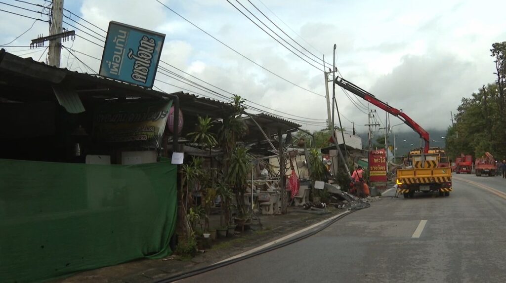 เชียงใหม่ 10 ก.ย. – เจ้าหน้าที่เร่งสำรวจความเสียหายและเคลียร์พื้นที่ หลังเกิดอุบัติเหตุรถบรรทุกน้ำดื่มพุ่งชนเสาไฟฟ้าริมถนน จ.เชียงใหม่ ล้มถึง 52 ต้น ทับบ้านเรือนพังเสียหาย 20 หลัง โดยจะเร่งติดตั้งเสาไฟใหม่และกู้ระบบไฟฟ้าให้ได้วันนี้