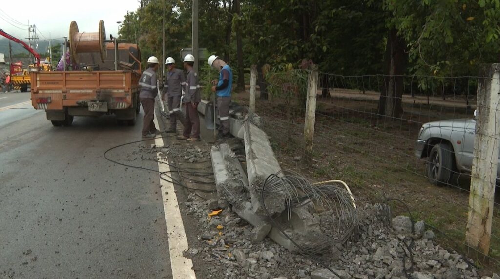 เจ้าหน้าที่ระดมกำลังนับร้อยคนเร่งขนย้ายเสาไฟฟ้ากว่า 50 ต้น ที่เสียหายและล้มขวางถนนกองกำลังผาเมือง ย่านหนองฮ่อ ในเมืองเชียงใหม่ ระยะทางกว่า 1 กิโลเมตร เพื่อเคลียร์พื้นที่ถนนและกู้ระบบไฟฟ้ากันตลอดทั้งคืน และจนถึงช่วงเช้าวันนี้ยังต้องปิดถนน เพื่อเร่งติดตั้งเสาไฟฟ้าใหม่และกู้ระบบไฟฟ้าให้กลับมาใช้ได้ หลังอุบัติเหตุรถกระบะบรรทุกน้ำแหกโค้งพุ่งชนเสาไฟฟ้าเมื่อวานนี้ จนคนขับบาดเจ็บสาหัส และผู้โดยสารที่นั่งมาด้วยเสียชีวิต 1 ราย ทำให้เสาไฟฟ้าแรงสูงขนาด 115 กิโลโวลต์ หักล้ม 24 ต้น และเสาไฟฟ้าแรงสูงขนาด 22 กิโลโวลต์ 23 ต้นและเสาไฟฟ้าฟ้าแรงต่ำอีก 5 ต้น รวมทั้งหมด 52 ต้น หม้อแปลง 7 ลูก และมิเตอร์ไฟฟ้า 34 เครื่อง ได้รับความเสียหาย