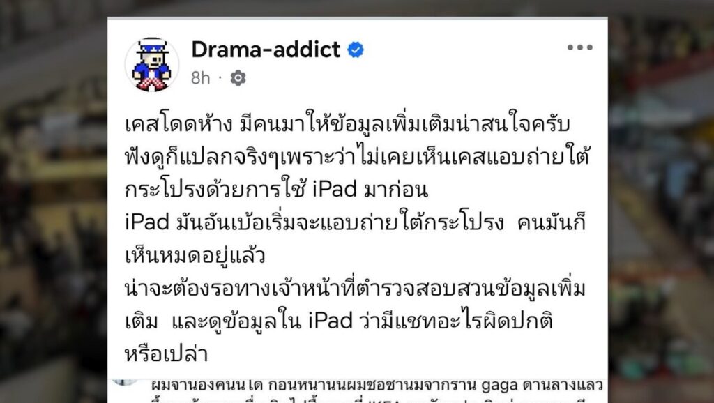 ด้านเพจเฟซบุ๊ก Drama-addict Drama-addict โพสต์ตั้งข้อสงสัยเกี่ยวกับเหตุการณ์นี้ โดยระบุว่า “เคสโดดห้าง มีคนมาให้ข้อมูลเพิ่มเติมน่าสนใจครับ ฟังดูก็แปลกจริงๆ เพราะว่าไม่เคยเห็นเคสแอบถ่ายใต้กระโปรงด้วยการใช้ iPad มาก่อน iPad มันอันเบ้อเริ่มจะแอบถ่ายใต้กระโปรง คนมันก็เห็นหมดอยู่แล้ว น่าจะต้องรอทางเจ้าหน้าที่ตำรวจสอบสวนข้อมูลเพิ่มเติม และดูข้อมูลใน iPad ว่ามีแชทอะไรผิดปกติหรือเปล่า” พร้อมกับโพสต์ภาพคอมเมนต์จากผู้ใช้เฟซบุ๊ก 2 ราย ให้ข้อมูลอ้างว่าก่อนเกิดเหตุเห็นผู้บาดเจ็บถูกผู้ชายอีกคนตะโกนด่า และถูกรายล้อมด้วยผู้ชายอีก 3-4 คน โดยท่าทีผู้บาดเจ็บไม่ได้ก้าวร้าวใส่ ยกมือไหว้ขอโทษอย่างเดียว ขณะที่อีกคอมเมนต์ระบุว่า ผู้บาดเจ็บอาจโดนบังคับให้ก่อเหตุ
