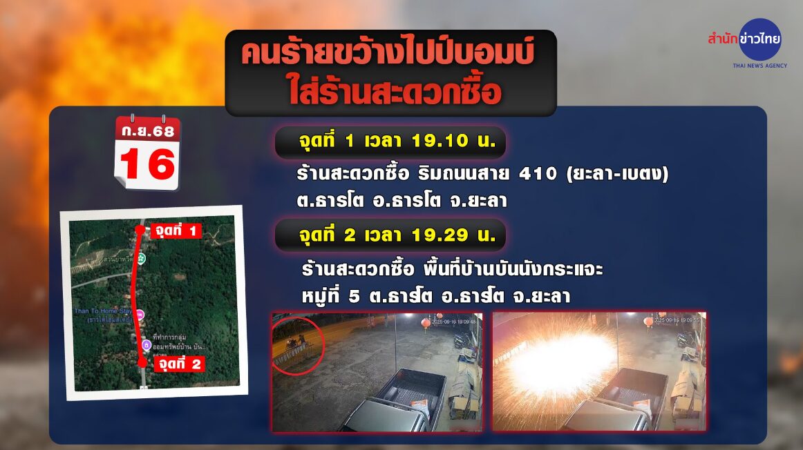 ผู้สื่อข่าวรายงานว่า ช่วงค่ำวันที่ 16 ก.ย. ศูนย์วิทยุ สภ.ธารโต จ.ยะลา ได้รับแจ้งจาก ผบ.ร้อยฉก.ตชด.441 ว่าเกิดเหตุคนร้าย 2 คน ขี่จักรยานยนต์นั่งซ้อนกัน มาขว้างระเบิดไปป์บอมบ์เข้าใส่ร้านสะดวกซื้อ ริมถนนสาย 410 (ยะลา-เบตง) ต.ธารโต อ.ธารโต จ.ยะลา เบื้องต้น ไม่มีผู้ใดรับบาดเจ็บหรือเสียชีวิต แต่กระจกและสิ่งของต่าง ๆ รวมถึงรถยนต์ที่จอดหน้าร้าน ได้รับความเสียหาย โดยกล้องวงจรปิดสามารถจับภาพผู้ก่อเหตุไว้ได้