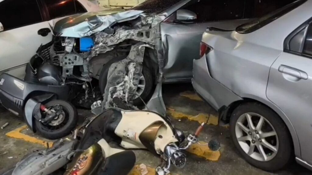 นนทบุรี 17 ก.ย. – ชนวินาศสันตะโร ตาวัย 73 ขับรถฝ่าฝน เห็นรถขับแซง ตกใจหักหัวรถไปพุ่งชนรถหลายคันที่จอดอยู่ริมถนน มีรถพังยับ 6 คัน คนเจ็บอีก 2 คน