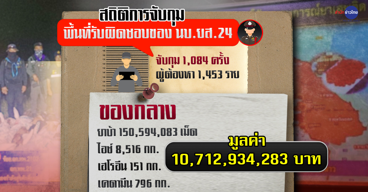 สำหรับการปราบปรามยาเสพติดตั้งแต่วันที่ 1 ต.ค. 67-31 ส.ค. 68) จับกุมผู้ต้องหา 1,453 ราย ยึดยาบ้า 150,594,083 เม็ด ไอซ์ 8,516 กิโลกรัม เฮโรอีน 151 กิโลกรัม เคตามีน 796 กิโลกรัม และอื่นๆ รวมมูลค่ากว่า 1 หมื่นล้านบาท