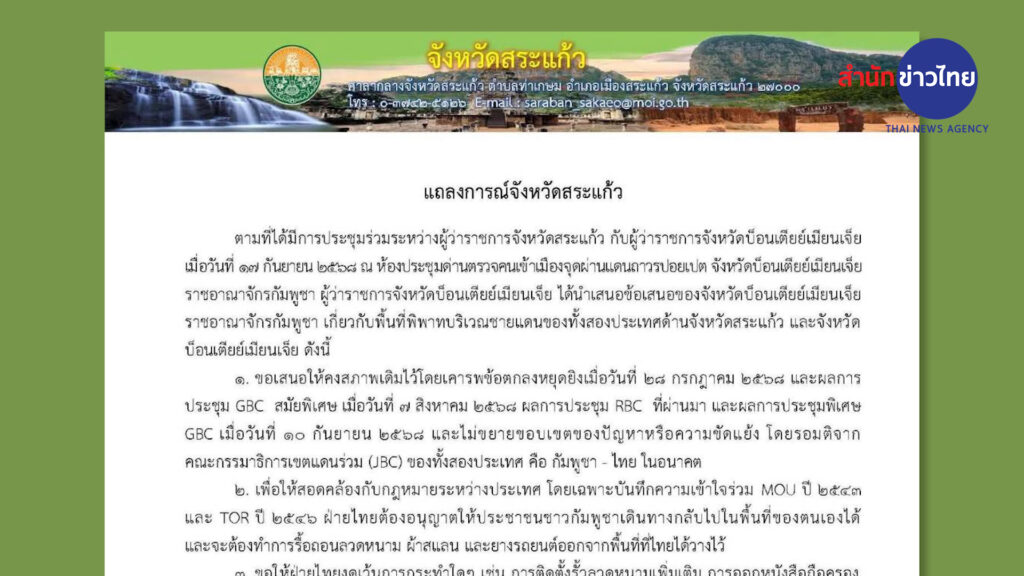 ทางจังหวัดสระแก้วได้ออกแถลงการณ์ พร้อมทำหนังสือตอบกลับ 4 ข้อเสนอของทางกัมพูชา ดังนี้