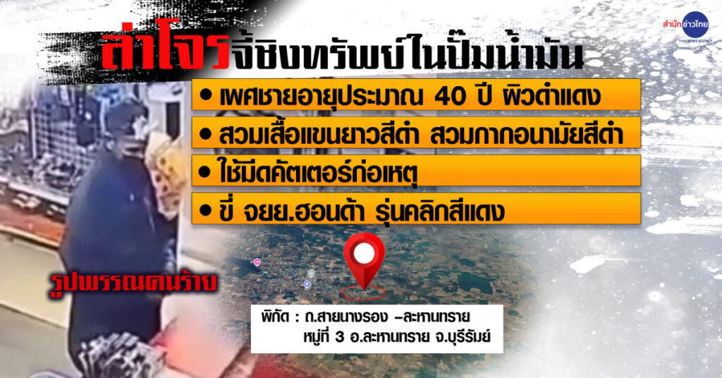 พนักงานในร้านเล่าว่า เมื่อราวตี 2 คนร้ายคนนี้ขี่รถจักรยานยนต์เข้ามาเติมน้ำมัน 50 บาท คาดเข้ามาดูลาดเลาก่อน พอผ่านไปเกือบชั่วโมง ตอนนั้นราวตี 3 ทำงานบริการอยู่ที่ปั๊ม มีชายอายุประมาณ 40-50 ปี ขี่จักรยานยนต์เข้ามาในปั๊ม แล้วไปจอดหน้าร้านสะดวกซื้อ ตะโกนบอกว่าจะซื้อของ จึงเข้าไปในร้านสะดวกซื้อ แล้วคนร้ายบอกให้หยิบเครื่องดื่มชูกำลังให้ จึงหยิบให้ 1 ขวด แต่คนร้ายบอกว่าจะเอา 4 ขวด ก็หยิบเพิ่มอีก 3 ขวด คนร้ายจ่ายเงินแล้วเดินออกไป สักพักวนกลับเข้ามาในร้านก็คิดว่าจะมาซื้อของเพิ่ม แต่กลับใช้คัตเตอร์ขู่บังคับให้เอาเงินที่กระเป๋าคาดเอวและในลิ้นชัก ได้ไปประมาณ 5,000 บาท และยังได้หยิบเอาโทรศัพท์มือถือของปั๊มไปด้วย รวมมูลค่า 10,000 บาท อยากให้เร่งติดตามจับกุมตัวคนร้ายให้ได้โดยเร็ว เพราะก่อเหตุอุกอาจ เกรงว่าจะกลับมาก่อเหตุซ้ำอีก ขณะที่เจ้าหน้าที่ตำรวจ สภ.ละหานทราย จ.บุรีรัมย์ กำลังไล่กล้องตามเส้นทางที่คาดว่าคนร้ายจะขับผ่าน เพื่อเร่งติดตามตัวมาดำเนินคดีตามกฎหมาย.-สำนักข่าวไทย