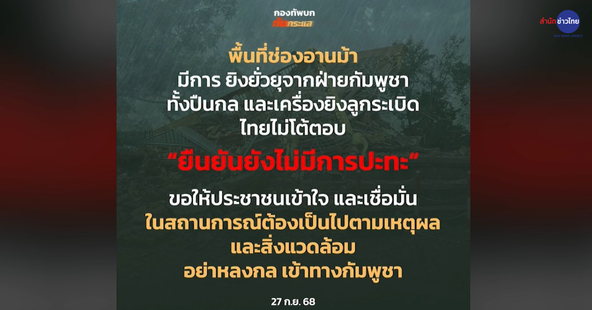 อุบลราชธานี 27 ก.ย. – ช่องอานม้าเดือด กัมพูชายิงปืนกล-ลูกระเบิดใส่ไทย ขณะที่เพจกองทัพบกทันกระแส โพสต์ระบุ “ยังไม่มีการปะทะ” ขอประชาชนเชื่อมั่นในสถานการณ์ต้องเป็นไปตามเหตุผลและสิ่งแวดล้อม อย่าหลงกลเข้าทางกัมพูชา