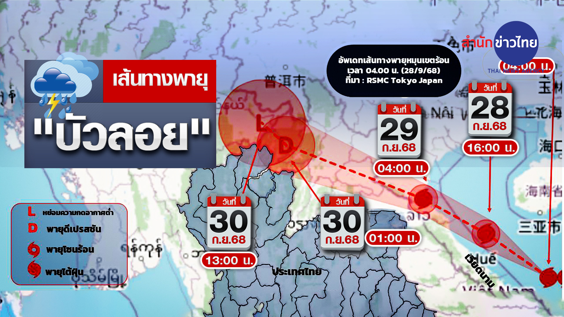 ทั้งหมดนี้เป็นการเตรียมความพร้อมเพื่อรับมือพายุไต่ฝุ่น “บัวลอย” ซึ่งจะขึ้นฝั่งเวียดนามพรุ่งนี้ แม้ว่าแนวโน้มศูนย์กลางไม่ได้เข้าไทยโดยตรง แต่บริเวณขอบของพายุจะมีฝนตกหนักถึงหนักมาก เสี่ยงน้ำท่วมฉับพลัน น้ำป่าไหลหลาก และดินถล่ม ในห้วงระหว่างวันที่ 29 ก.ย. – 1 ต.ค.นี้ -สำนักข่าวไทย