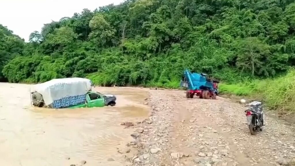 ขณะที่เส้นทางสู่ชายแดนบ้านเสาหิน ต.เสาหิน มีฝนตกหนัก ส่งผลทำให้น้ำในลำห้วยไหลหลากและมวลน้ำเพิ่มระดับสูงขึ้นเป็นระยะ โดยเฉพาะน้ำแม่แงะ บริเวณท่าน้ำแม่เจ การสัญจรเส้นทางต้องใช้ความระมัดระวังมากเป็นพิเศษ ชาวบ้านต้องใช้เชือกผูกตัวรถ เพื่อช่วยดึงรถขึ้นฝั่ง เนื่องจากน้ำสูงไหลเชี่ยวมาก เกรงพัดรถลอยหาย