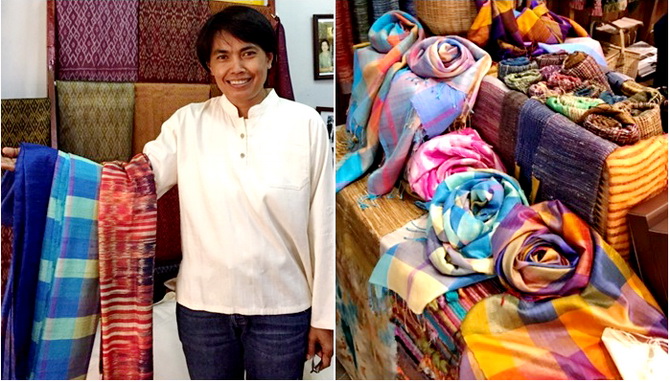 นางแสงเดือน จันทร์นวล ผ้าคลุมไหล่ไหม จ.บุรีรัมย์ นางสาวธัญรดา พลายชมพู ผ้าทอมือลายขัด จ.ประจวบคีรีขันธ์