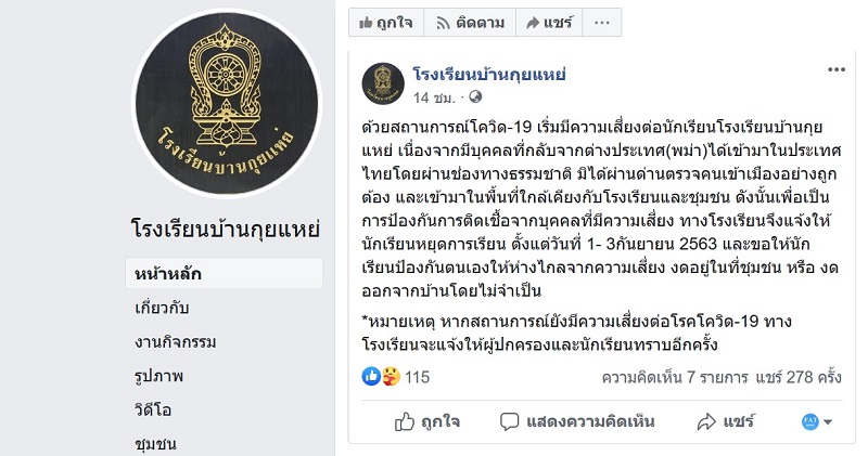 นายนิล โชคสงวนทรัพย์ ผู้อำนวยการโรงเรียนบ้านกุยแหย่ โพสต์แจ้งผู้ปกครองและนักเรียนกรณีมีความจำเป็นต้องปิดการเรียนการสอนชั่วคราวเป็นเวลา 3 วัน ตั้งแต่วันที่ 1-3 ก.ย.นี้ เพื่อความปลอดภัยและลดความเสี่ยงของโควิด-19 เนื่องจากที่ผ่านมามีบุคคลกลับจากเมียนมาผ่านช่องทางธรรมชาติเข้ามาในในพื้นที่ใกล้เคียงกับโรงเรียนและชุมชน ดังนั้น เพื่อป้องกันการติดเชื้อจากบุคคลที่มีความเสี่ยง และขอให้นักเรียนป้องกันตนเองให้ห่างไกลจากความเสี่ยง งดอยู่ในที่ชุมชน หรืองดออกจากบ้านโดยไม่จำเป็น