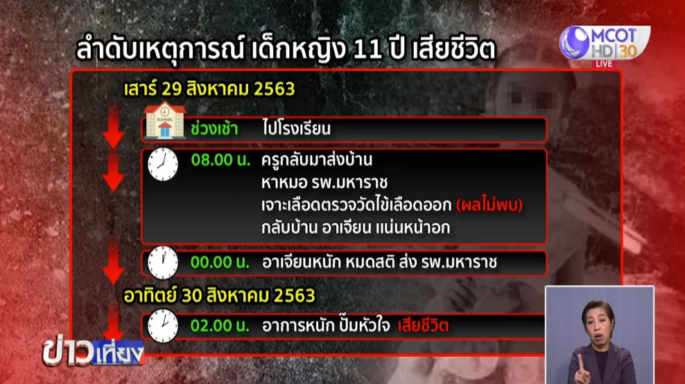 จากนั้นแพทย์ได้ซักประวัติลูกสาว จึงบอกว่าโรงเรียนได้ฉีดวัคซีน จากนั้นแพทย์ได้ตรวจอุณหภูมิไข้สูงถึง 39 องศา และโรงพยาบาลได้เจาะเลือดตรวจวัดไข้เลือดออก แต่ผลออกมาก็ไม่พบ จึงจ่ายยาให้กลับมานอนพักฟื้นที่บ้าน แต่ปรากฏว่า “น้องครีม” อาเจียนไม่หยุดและแน่นหน้าอก กระทั่งประมาณเที่ยงคืนของวันเสาร์เข้าไปอาเจียนในห้องน้ำ แม้พยายามเรียก แต่ “น้องครีม” ไม่ขานตอบ จึงเปิดเข้าไปดู และพบลูกสาวสลบไป จึงรีบพาส่งโรงพยาบาลมหาราช แม้ทีมแพทย์และพยาบาลพยายามปั๊มหัวใจ แต่ไม่สามารถยื้อชีวิตได้ และเสียชีวิตในเวลา 02.00 น. ด้วยอาการหัวใจล้มเหลวกะทันหัน และหลังเกิดเหตุได้พูดคุยกับ ผอ.โรงเรียน แล้วว่าเหตุใดจึงไม่วัดไข้ก่อนฉีดวัคซีน แต่กลับไม่มีคำตอบให้