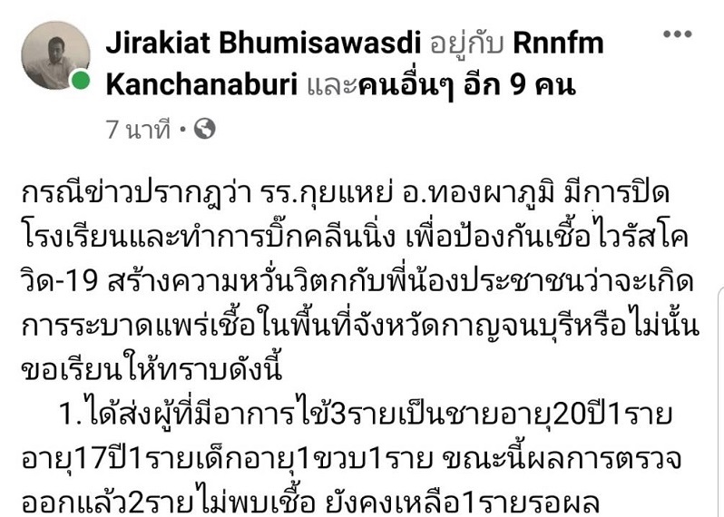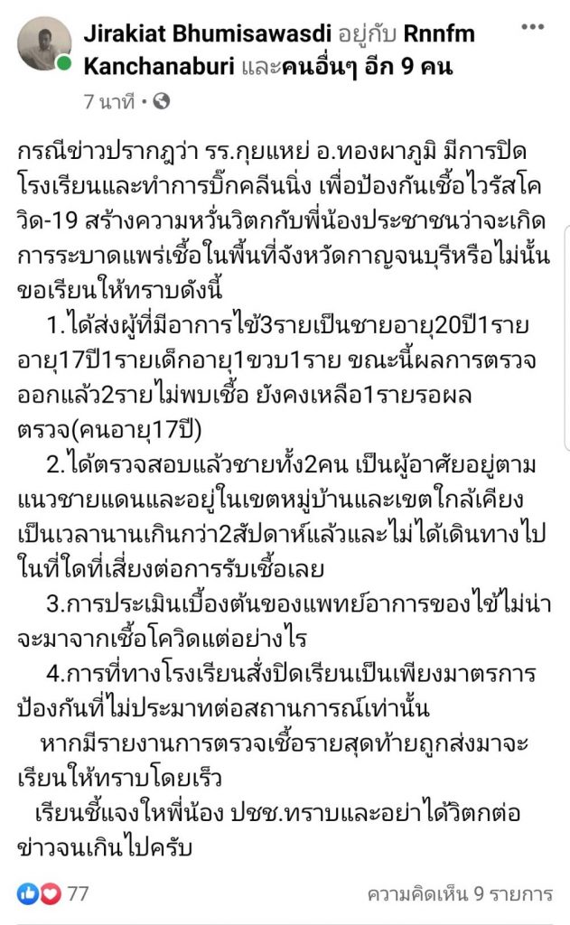 ล่าสุดนายจีระเกียรติ ภูมิสวัสดิ์ ผู้ว่าราชการจังหวัดกาญจนบุรี โพสต์เฟซบุ๊กส่วนตัวว่า ผลการตรวจชายวัย 20 ปี และเด็กอายุ 1 ปี ผลออกมาเป็นลบ ไม่พบเชื้อโควิด-19 แต่ยังคงต้องรอผลการตรวจอีกคนเป็นชาย 17 ปี ส่วนการตรวจสอบภูมิลำเนาชายทั้ง 2 คน พบว่าเป็นผู้ที่อาศัยอยู่ตามแนวชายแดนและในเขตหมู่บ้านใกล้เคียงมาเป็นเวลานานเกินกว่า 2 สัปดาห์แล้ว และไม่ได้เดินทางเข้าไปในพื้นที่เสี่ยงต่อการรับเชื้อ จากการตรวจวินิจฉัยประเมินอาการป่วยโดยแพทย์ คาดว่าไม่น่าจะมาจากโควิด ส่วนการปิดโรงเรียนนั้น ถือเป็นมาตรการป้องกันที่ไม่ประมาทต่อสถานการณ์เท่านั้น อย่างไรก็ตาม หากมีรายงานการตรวจเชื้อรายสุดท้ายถูกส่งมาจะรีบแจ้งให้ทราบโดยเร็ว และขอประชาชนอย่าวิตกกังวลเรื่องนี้