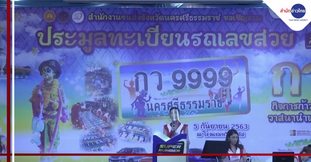สำนักงานขนส่งจังหวัดนครศรีธรรมราชจัดประมูลป้ายทะเบียนรถเลขสวย หมวด กว “กิจการก้าวหน้า วาสนานำพาโชค มีประชาชนผู้สนใจเข้าร่วมประมูลกันคึกคัก และเป็นการจัดประมูลแบบ New Normal มีป้ายทะเบียนรวม 301 ป้าย ผ่านพิธีพุทธาภิเษก จากวัดเจดีย์ แผ่นป้ายทะเบียนได้นำเอกลักษณ์จังหวัดเป็นพื้นหลัง ได้แก่ ภาพแหล่งท่องเที่ยวตามธรรมชาติ ภาพนกกินปลีหางเขียว ภาพมโนราห์ และหนังตะลุง ป้ายทะเบียนที่ผู้ประมูลสนใจ ได้แก่ กว-9999 น และ กว-5555 นครศรีธรรมราช โดยรายได้ส่วนหนึ่งไปจัดซื้ออุปกรณ์ช่วยเหลือผู้พิการที่ประสบภัยจากการใช้รถใช้ถนน ในปี 2563 ตั้งเป้านำเงินสนับสนุนกองทุน จำนวน 280 ล้านบาท ซึ่งจะส่งมอบให้แต่ละจังหวัดประมาณ 3–5 ล้านบาท ต่อจังหวัด.-สำนักข่าวไทย