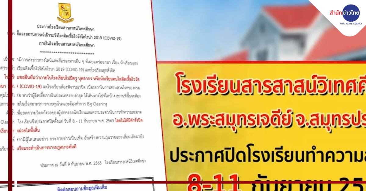 โรงเรียนสารสาสน์วิเทศศึกษา ในอำเภอพระสมุทรเจดีย์ จังหวัดสมุทรปราการ ออกหนังสือแถลงการณ์ หลังมีข่าวบางสำนักนำเสนอว่ามีผู้ปกครองของนักเรียนติดเชื้อโควิด-19 และถูกสั่งปิดโรงเรียน โดยเนื้อหาในแถลงการณ์ระบุว่า “เนื่องจากมีการส่งข่าวทางไลน์และสื่อช่องทางอื่นๆ ที่เผยแพร่ออกมา เรื่องนักเรียนและบุคลากรของโรงเรียนติดเชื้อไวรัสโคโรนา 2019 (COVID-19) และโรงเรียนถูกสั่งปิด