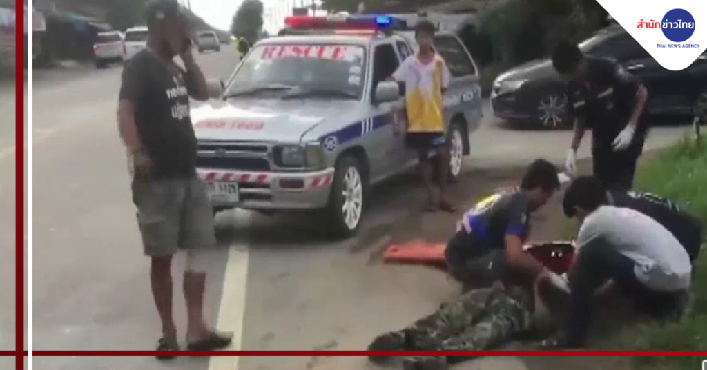 ชลบุรี 13 ก.ย.-หนุ่มใหญ่วัย 44 ปี แต่งกายด้วยชุดทหาร จอดมอเตอร์ไซค์ริมถนน ก่อนวิ่งข้ามถนนจะไปซื้อก๋วยเตี๋ยว ถูกรถ 6 ล้อชนร่างกระเด็น บาดเจ็บสาหัส