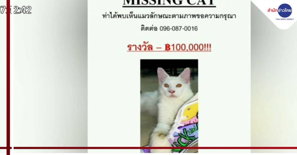 ชลบุรี 18 ก.ย. – หญิงชาวรัสเซียประกาศจ่าย 100,000 บาท ให้คนที่พบเห็นแมวพันธุ์เมนคูนที่หายออกจากบ้านใน ต.หนองปลาไหล อ.บางละมุง จ.ชลบุรี แล้วนำมาคืน เผยมีค่าต่อจิตใจและเป็นที่รักของครอบครัว
