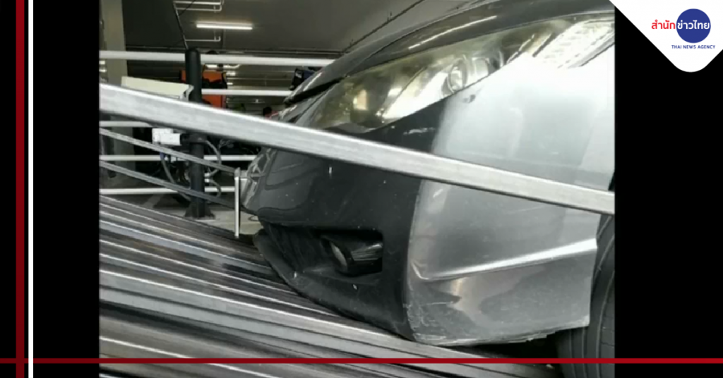 นนทบุรี 23 ก.ย.-ระทึก! เหล็กร่วงจากกระบะพุ่งใส่รถเก๋ง 3 แม่ลูก ขณะขับขึ้นอาคารจอดรถ เหล็กเสียบใต้ท้องรถ ไม่มีใครบาดเจ็บ แต่รถเสียหาย