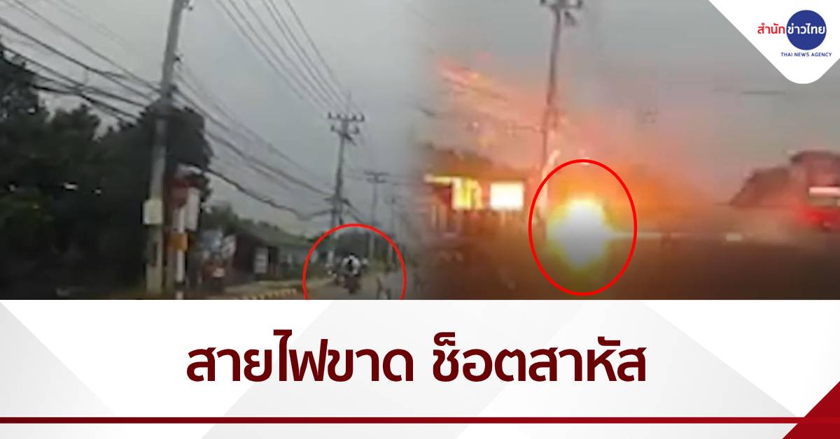 ปทุมธานี 23 ก.ย.-หวาดเสียว! สายไฟขาดร่วงช็อตครูฝึกสอน-นักเรียน ที่ขี่จักรยานยนต์ผ่าน ไฟลุกท่วมเจ็บสาหัส พบก่อนเกิดเหตุฟ้าผ่าสายไฟขาด เจ้าหน้าที่ยังไม่ทันลงพื้นที่แก้ไข ด้าน กฟภ.รับผิดชอบทั้งหมด