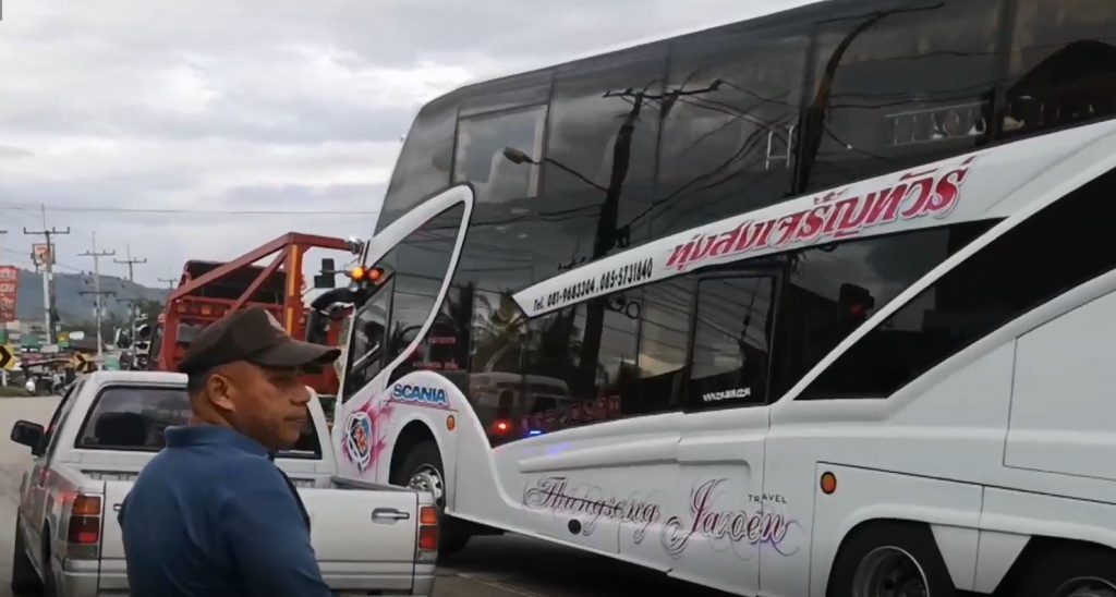 นายวรายุทธ หรือเอก ปานชาติ คนขับรถทัวร์ ให้การว่า รับจ้างขับรถพา อสม.จากจังหวัดพัทลุง ไปเที่ยวที่พังงาตามโครงการรัฐบาล เมื่อมาถึงบริเวณแยกไฟแดง ได้ชะลอหยุดรถ แต่ปรากฏว่ารถกระบะที่วิ่งสวนเลน และขับมาด้วยความเร็ว เกิดหลุดโค้งมาชนรถทัวร์เข้าอย่างจัง จะหักหลบก็ไม่ทัน โชคดีผู้โดยสารที่นั่งมา 30 คนไม่ได้รับบาดเจ็บ