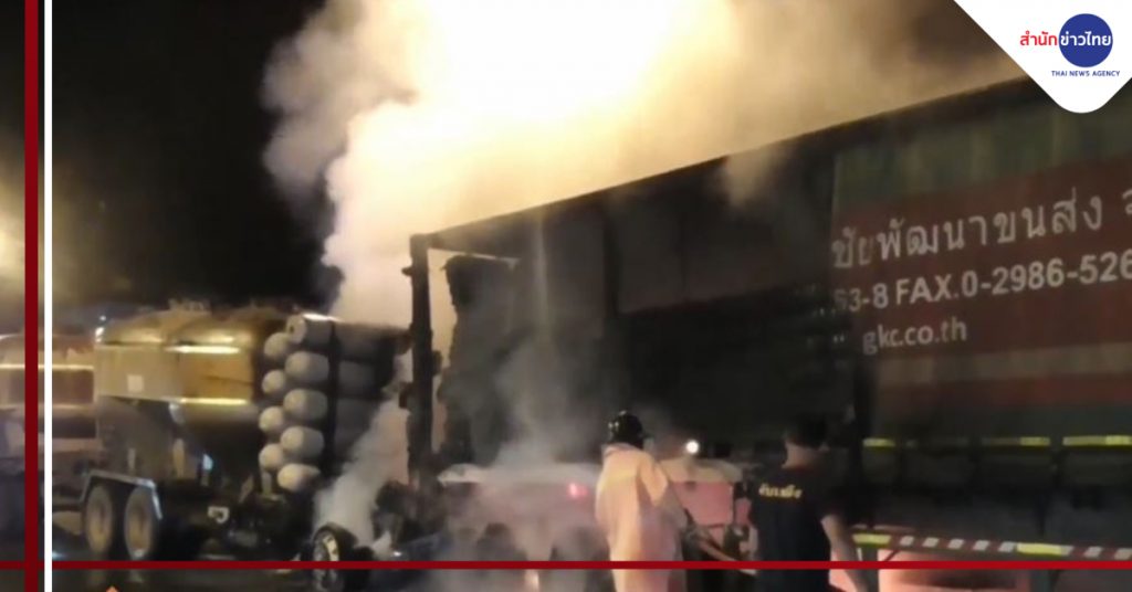 ที่เกิดเหตุอยู่บนถนนสายเอเชียขาเข้ากรุงเทพฯ กม.ที่ 59 หมู่ 2 ต.จรเข้ร้อง อ.ไชโย จ.อ่างทอง พบไฟกำลังลุกไหม้รถ 18 ล้อ บรรทุกแร่ หมายเลขทะเบียน 89-5667 นครสวรรค์ ซึ่งชนท้ายรถเทรลเลอร์ หมายเลขทะเบียน 70-8815 ปทุมธานี เจ้าหน้าที่ต้องระดมฉีดน้ำอย่างระมัดระวัง เนื่องจากจุดที่ไฟลุกไหม้มีถังแก๊สเชื้อเพลิงกว่า 10 ถัง เกรงว่าจะเกิดการระเบิดขึ้น โดยใช้เวลากว่า 30 นาที จึงสามารถควบคุมเพลิงไว้ได้ ส่งผลให้การจราจรบนถนนสายเอเชียติดขัดยาวหลายกิโลเมตร
