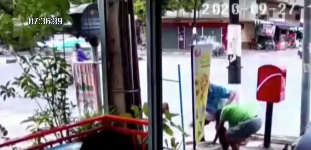เหตุการณ์เกิดขึ้นเมื่อวาน (27 ก.ย.) เป็นภาพคนร้ายใส่เสื้อยืดสีเขียว สวมกางเกงขาสามส่วน กำลังปลุกปล้ำกับคนขับรถสองแถวสายหนองมน-บางแสน ที่ใส่เสื้อแขนยาวสีฟ้า แต่คนร้ายอาศัยความคล่องตัวดิ้นหลุดจากคนขับรถสองแถว ก่อนขโมยรถจักรยานของเด็กวัย 9 ขวบปั่นหนีหายไป