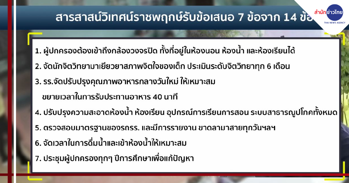 - ผู้ปกครองจะเข้าถึงกล้องวงจรปิด ทั้งที่อยู่ในห้องนอน ห้องน้ำ และห้องเรียนได้ แต่ต้องได้รับการยินยอมจากผู้ปกครองของนักเรียนในห้องด้วยกันเอง โดยโรงเรียนจะจัดการเรื่องนี้ภายใน 10 วัน