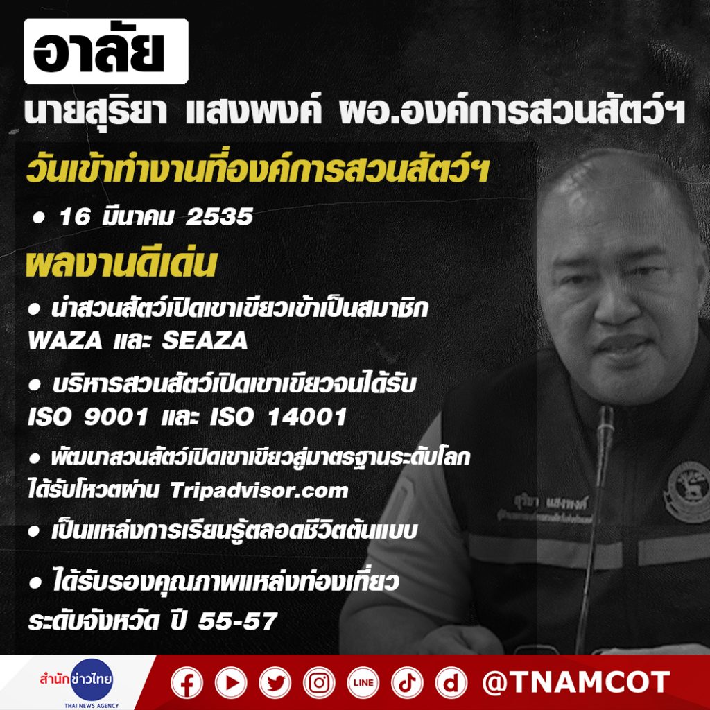 3 ต.ค. – อาลัย นายสุริยา แสงพงค์ ผอ.องค์การสวนสัตว์ฯ ถูกเจ้าหน้าที่สวนสัตว์สงขลายิงเสียชีวิต ระหว่างลงพื้นที่ตรวจสอบข้อเท็จจริงกรณีลูกเก้งเผือกที่สวนสัตว์สงขลา โดยนายสุริยา เพิ่งได้รับตำแหน่งเมื่อวันที่ 1 ตุลาคมที่ผ่านมา