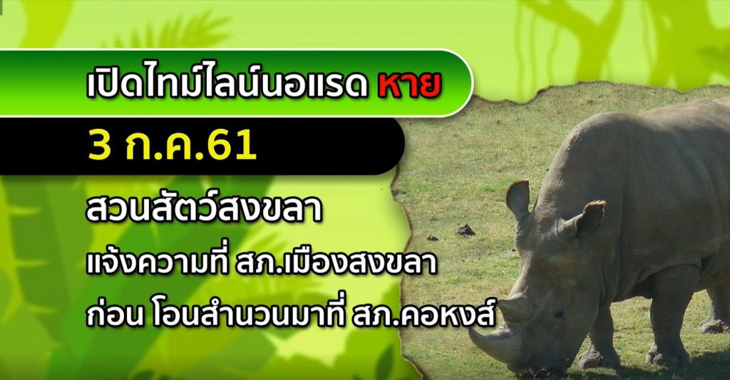 3 กรกฎาคม ปี 61 สวนสัตว์สงขลาได้เข้าแจ้งความกับ สภ.เมืองสงขลา ก่อนที่จะมีการโอนสำนวนมาที่ สภ.คอหงส์ ซึ่งเป็นพื้นที่ต้นเรื่องที่นอแรดหายไป จากนั้น สวนสัตว์ได้สอบสวนติดตามนอแรดที่หายไป ทำให้ทราบว่า มีเจ้าหน้าที่ 1 คน เบิกนอแรดมา และเมื่อไปสอบถาม เจ้าหน้าที่คนดังกล่าวได้อ้างและทำเอกสารเท็จว่าเบิกนอแรดที่เป็นนอทู่ มาเพียงนอเดียว ไม่ได้เบิกมา 2 นออย่างที่ถูกกล่าวอ้าง โดยมีหลักฐานอยู่กับตัวแค่นอเดียวเท่านั้น