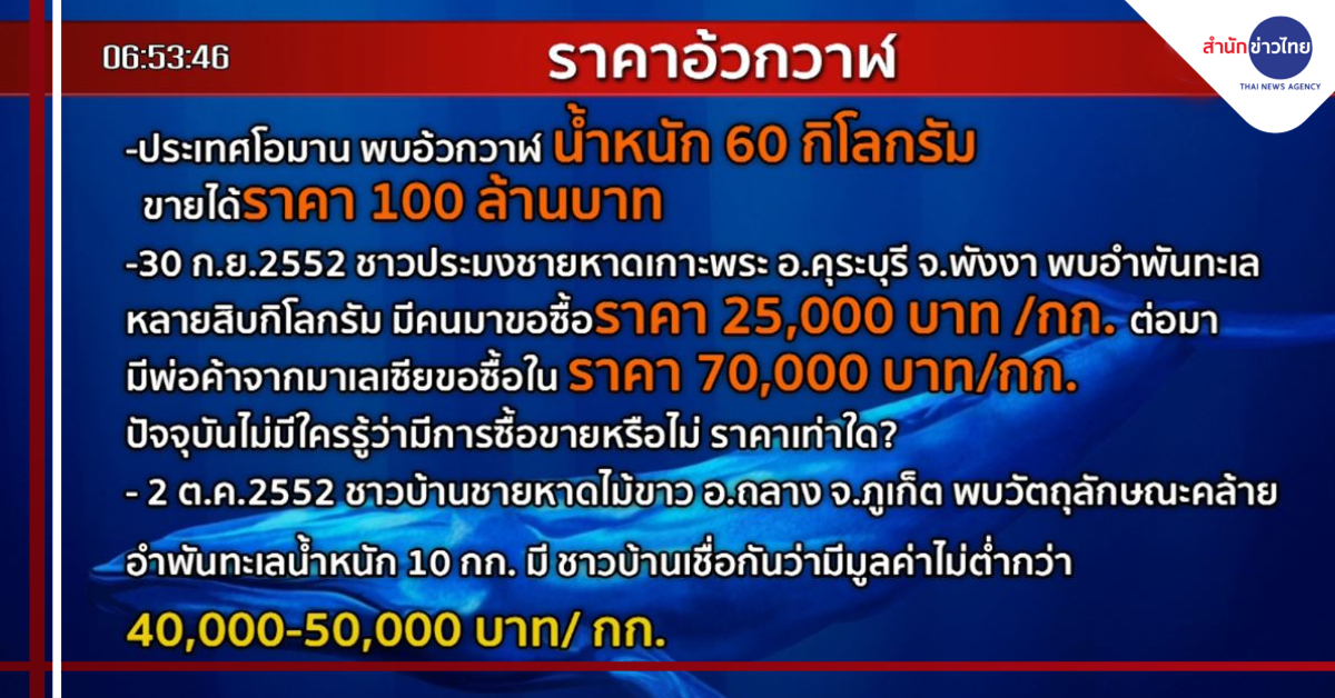 มีรายงานว่า ก่อนหน้านี้เคยมีผู้พบเห็นอ้วกวาฬหลายราย และขายได้ในราคาสูง เช่น ประเทศโอมาน พบอ้วกวาฬ น้ำหนัก 60 กิโลกรัม ขายได้ราคา 100 ล้านบาท