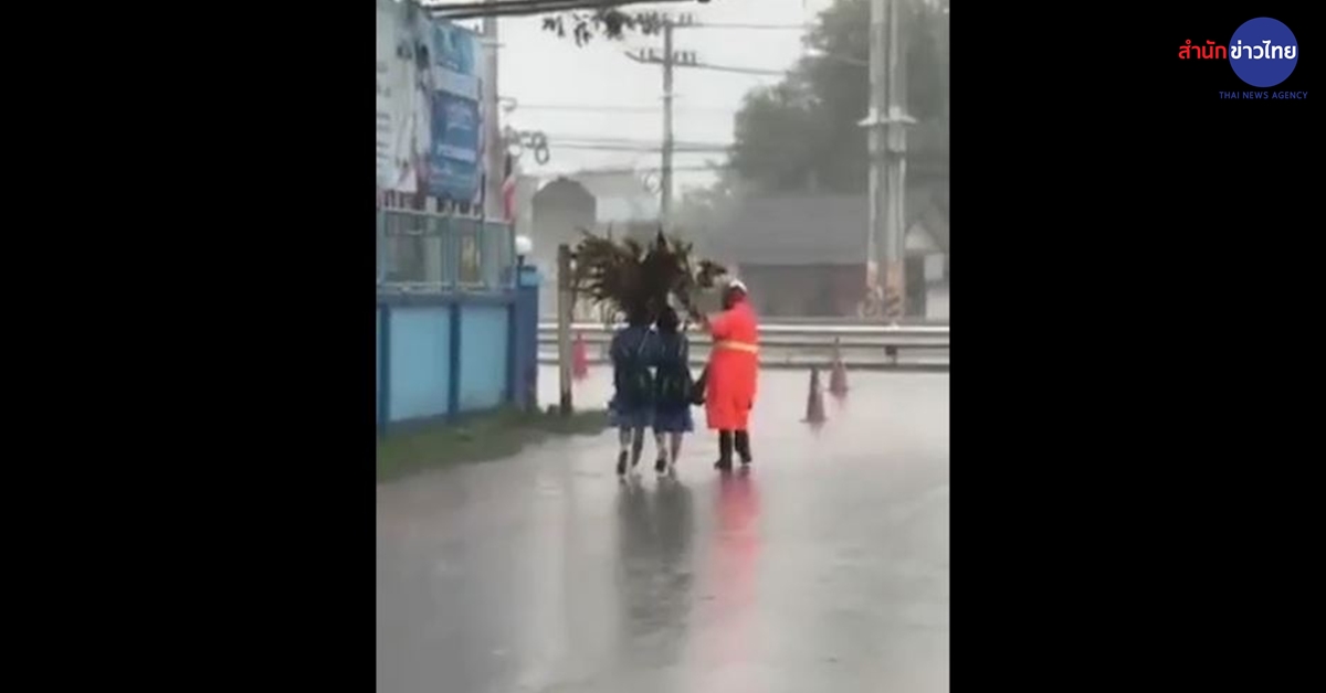 ปราจีนบุรี 9 ต.ค. – โลกโซเชียลแห่ชื่นชมตำรวจจราจรช่วยเหลือเด็กนักเรียน ใช้ใบตาลกางแทนร่มพาเด็กเข้าห้องเรียน ขณะที่ฝนตกหนัก