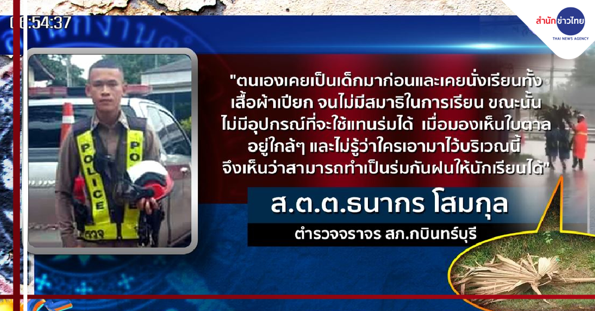 จากการสอบถามไปยัง สภ.กบินทร์บุรี ทราบว่า ตำรวจที่ปรากฏในคลิป ชื่อ ส.ต.ต.ธนากร โสมกุล ตำรวจจราจร สภ.กบินทร์บุรี โดยให้ข้อมูลสั้นๆ ว่า ขณะเกิดเหตุไม่ทราบว่ามีการถ่ายคลิป ซึ่งขณะนั้นไม่มีอุปกรณ์ใดๆ แทนร่มได้ แต่มองเห็นใบตาลอยู่ใกล้ๆ และเห็นว่าสามารถกันฝนได้ระดับหนึ่ง จึงหยิบมาทำร่มให้นักเรียน ซึ่งช่วงนั้นคิดว่าสิ่งที่พอช่วยประชาชน โดยเฉพาะเด็กๆ ได้ก็พอจะทำได้ และในอดีตตนเองเคยเป็นเด็กมาก่อน เคยนั่งเรียนทั้้งเสื้อผ้าเปียกปอน จนไม่มีสมาธิในการเรียนมาแล้ว. – สำนักข่าวไทย