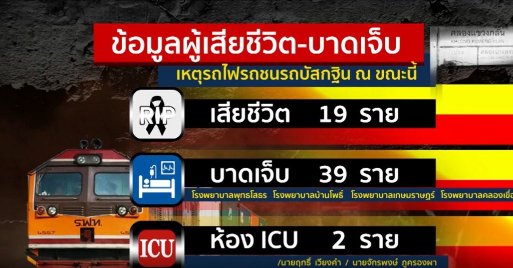 ฉะเชิงเทรา 12 ต.ค.-ผู้บังคับการตำรวจภูธรจังหวัดฉะเชิงเทรา ยืนยันตัวเลขผู้เสียชีวิตจากโศกนาฏกรรมครั้งนี้อยู่ที่ 19 รายหลังมีผู้เสียชีวิตเพิ่มเติมเมื่อคืนที่ผ่านมา พร้อมวิเคราะห์ 6 สาเหตุหลักที่ทำให้เกิดอุบัติเหตุรถไฟชนรถบัส