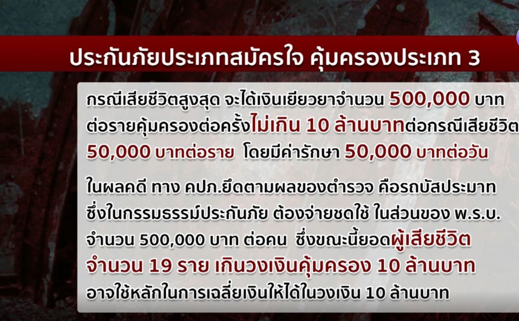 ด้านนายสุทธิพล ทวีชัยการ เลขาธิการ คปภ. ให้ข้อมูลสำนักข่าวไทยว่า ค่าสินไหมทดแทนตามสัญญาประกันภัยรถยนต์นอกเหนือจากนี้ จะต้องรอผลคดีจากพนักงานสอบสวนว่าฝ่ายใดเป็นฝ่ายประมาท และหากพบว่าผู้บาดเจ็บหรือเสียชีวิตทำประกันภัยประเภทอื่น ทั้งกรมธรรมพ์ประกันชีวิต หรือกรมธรรม์อุบัติเหตุ จะได้รับค่าสินไหมทดแทนเพิ่มเติม.-สำนักข่าวไทย