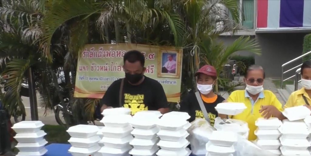 นายเล็ก พันคง อายุ 71 ปี เจ้าของร้านไก่อบฟางชื่อดังเมืองชัยนาท ร่วมกับผู้ใจบุญชาวชัยนาท และผู้ใจบุญชาวสุพรรณบุรี จำนวนกว่า 30 ราย ร่วมกันนำข้าวไก่อบฟาง จำนวน 1,000 กล่อง ข้าวกะเพราหมู 500 กล่อง ขนมเค้กกล้วยหอม 1,000 ชิ้น ขนมเปียกปูน 1,000 ชิ้น และน้ำดื่ม 1,000 แก้ว ไปแจกจ่ายให้ประชาชนรับประทาน “ฟรี” เป็นการทำความดี เดินตามรอยเท้าพ่อ เพื่อถวายเป็นพระราชกุศลและน้อมรำลึกในพระมหากรุณาธิคุณอันยิ่งใหญ่เป็นล้นพ้นหาที่สุดมิได้ ของพระบาทสมเด็จพระบรมชนกาธิเบศร มหาภูมิพลอดุลยเดชมหาราช บรมนาถบพิตร เนื่องในโอกาสวันคล้ายวันสวรรคตของพระบาทสมเด็จพระบรมชนกาธิเบศร มหาภูมิพลอดุลยเดชมหาราช บรมนาถบพิตร 13 ตุลาคม 2563.-สำนักข่าวไทย