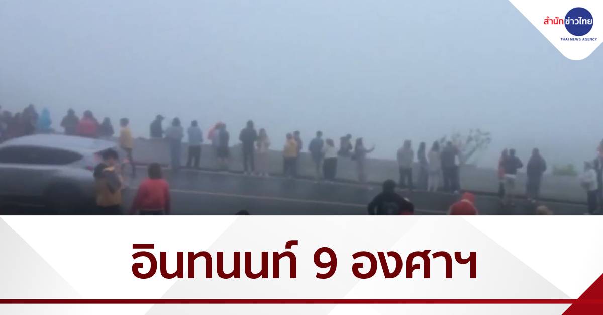 สภาพอากาศบนดอยอินทนนท์ อ.จอมทอง จ.เชียงใหม่ เช้าวันนี้ มีหมอกลงจัด ทัศนวิสัยการมองเห็นลดลง เหลือประมาณ 30 เมตร และยังมีฝนตกปรอยๆ เตือนนักท่องเที่ยว ที่นำรถยนต์ส่วนตัวขึ้นไป ให้ใช้ความระมัดระวัง ช่วงที่เป็นทางลาดชัน ทางขึ้นบริเวณพระมหาธาตุฯ จนถึงยอดดอยจุดสูงสุด ขณะเดียวกันสภาพอากาศยังหนาวเย็น เช้าวันนี้บริเวณจุดชมวิวกิ่วแม่ปาน กิโลเมตรที่ 42 อุณหภูมิยังเลขตัวเดียว 9 องศาเซลเซียส ทำให้มีสภาพอากาศที่หนาวเย็น ประกอบกับมีฝนปรอยๆ อากาศปิด แต่ยังคงมีนักท่องเที่ยวขึ้นไปสัมผัสอากาศหนาวในช่วงวันหยุดกันอย่างคึกคัก ส่วนบริเวณยอดดอยจุดสูงสุด อุณหภูมิ 12 องศาเซลเซียส ส่วนที่ทำการกิโลเมตรที่ 32 อากาศเย็นสบาย 17 องศาเซลเซียส และที่เป็นไฮไลต์ นักท่องเที่ยวยังคงไปยืนถ่ายภาพบริเวณป้ายจุดสูงสุดแดนสยาม