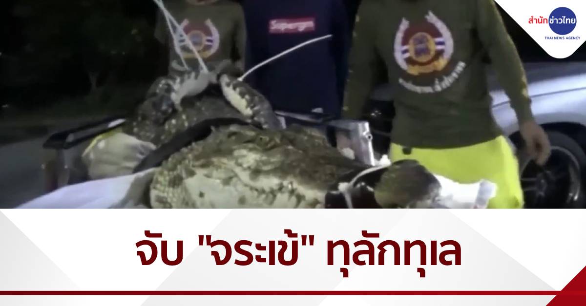 สระบุรี 20 ต.ค.-มูลนิธิทุลักทุเล จับจระเข้ตัวใหญ่ โผล่คลองระพีพัฒน์ จะเข้าบ้าน เจอหมาล้อมไว้ รุมเห่ากันขรม จระเข้นอนนิ่งไม่หนีไปไหน