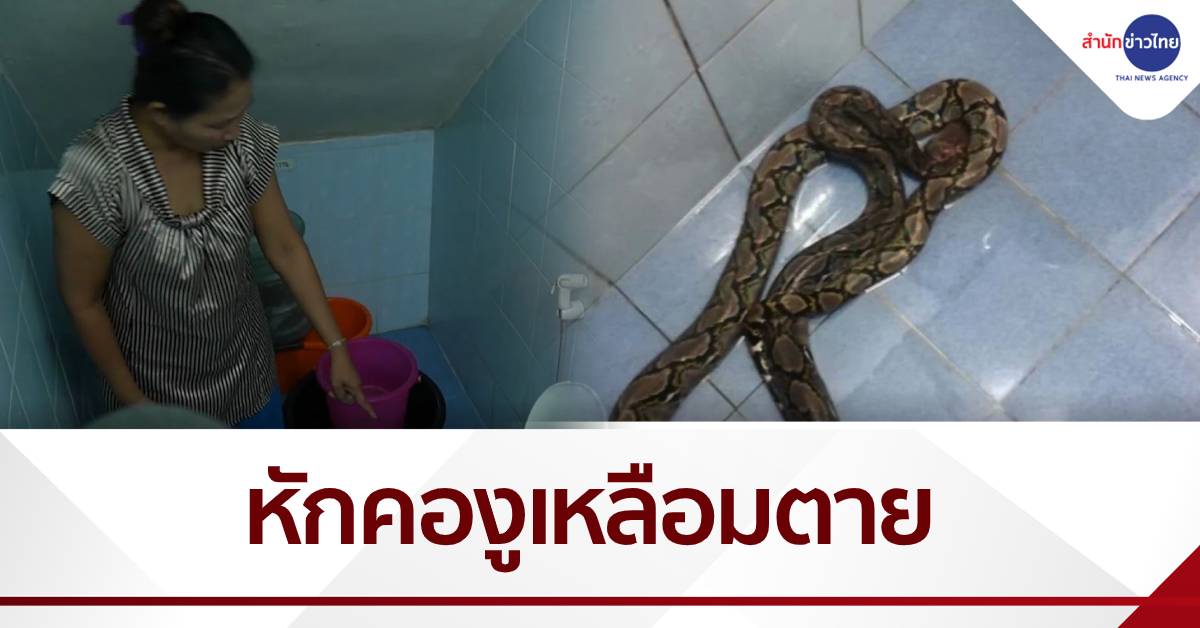 สมุทรปราการ 20 ต.ค.-เตือนภัย สัตว์เลื้อยคลานในหน้าฝน เมื่อสาวใหญ่ใจเด็ดหักคองูเหลือมที่กัดแก้มก้น ขณะกำลังจะปลดทุกข์บนชักโครก เผยอยู่มากว่า 10 ปีไม่เคยเจอ