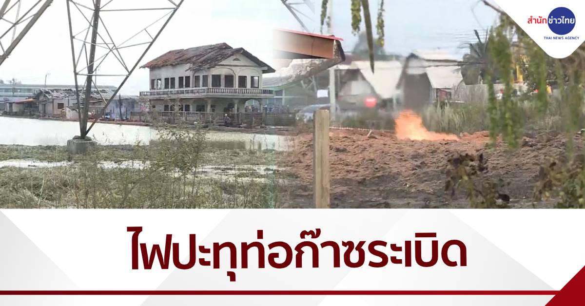 สมุทรปราการ 22 ต.ค.-เปลวไฟลุกไหม้ขึ้นอีกครั้งบริเวณท่อก๊าซระเบิด เจ้าหน้าที่กันผู้ไม่เกี่ยวข้องออก ปภ.เผยขณะนี้มีผู้บาดเจ็บ 28 คน เสียชีวิต 3 คน สำรวจพบบ้านเพิ่งสร้างเสร็จเมื่อ 2 เดือนก่อน ด้วยเงินหลักล้านบาท พังยับเหลือแต่ซาก