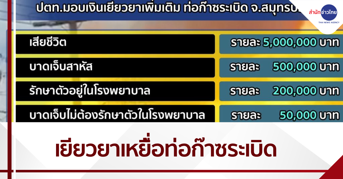 รองนายกรัฐมนตรีลงพื้นที่ตรวจสอบจุดเกิดเหตุท่อก๊าซระเบิดที่ อ.บางบ่อ จ.สมุทรปราการ ขณะที่ ปตท. เยียวยาผู้เสียชีวิตรายละ 5 ล้านบาท