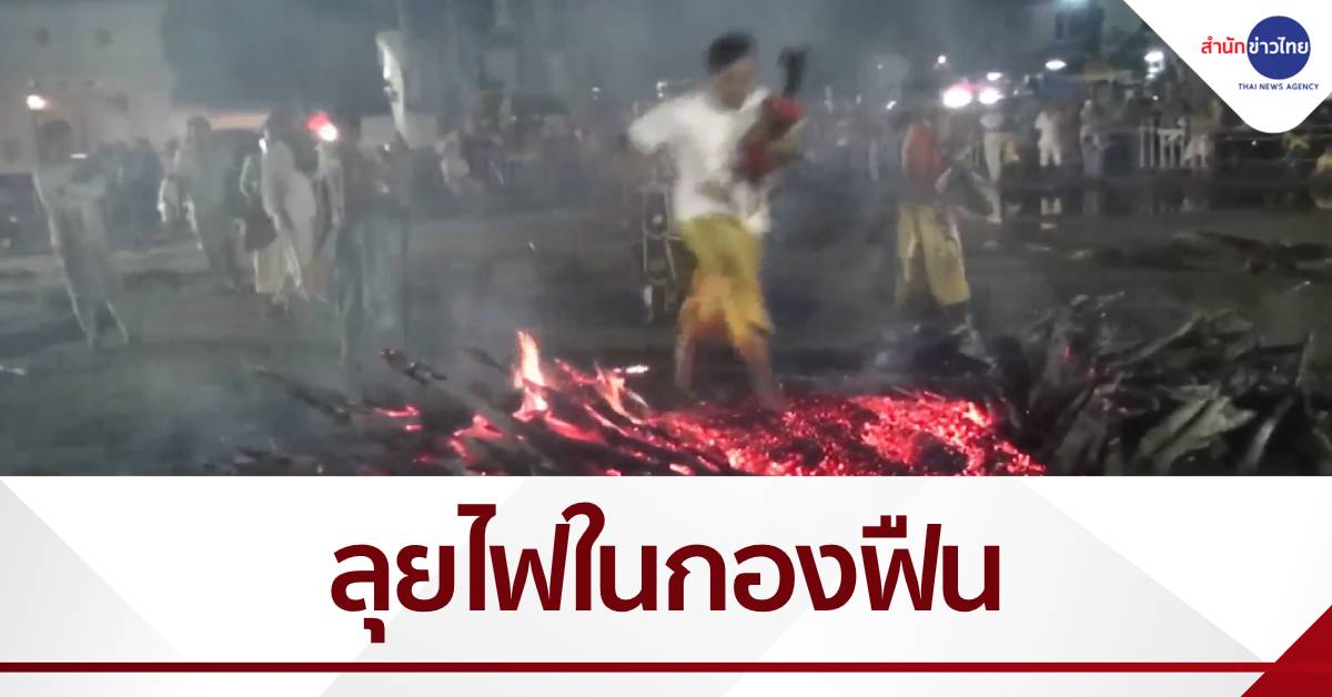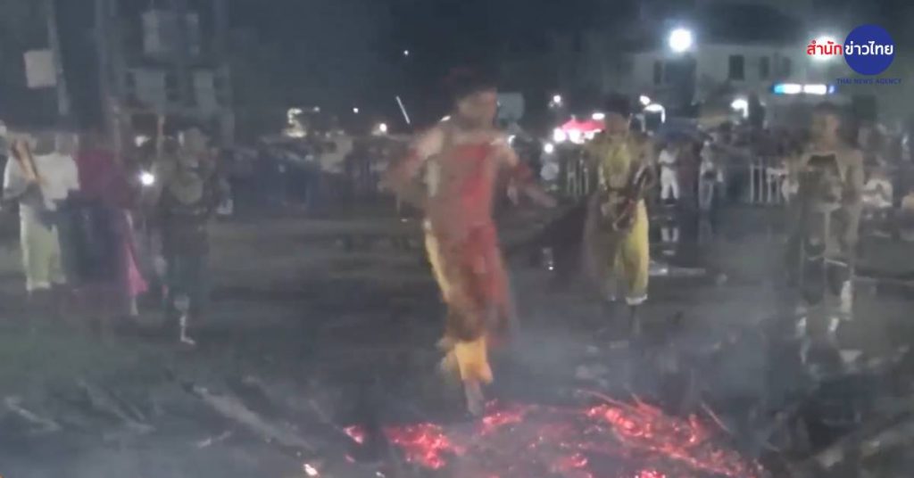โดยพิธีลุยไฟที่นี่มีการนำไม้ฟืนยาวประมาณ 2 เมตร มาสุมรวมกันเป็นแนวตั้งและจุดไฟ เพื่อให้เหลือเพียงเถ้าถ่านที่แดงกล่ำ จากนั้นจึงอัญเชิญองค์พระขึ้นประทับบนเกี้ยว บรรดาร่างทรงแบกหามเกี้ยวองค์พระอันศักดิ์สิทธิ์เดินเข้าในบริเวณพิธีและเวียนรอบกองไฟ 3 รอบ นำมาประดิษฐานหน้ากองไฟ และร่างทรงก็เริ่มเดินลุยผ่านกองไฟที่มีถ่านเป็นสีแดง เพื่อแสดงอิทธิฤทธิ์ปาฏิหาริย์ของร่างทรงของแต่ละคน รวมทั้งผู้ที่ถือศีลกินเจ และมีใจกล้าก็ร่วมเดินลุยไฟในพิธีด้วยเพื่อชำระล้างบาปและสิ่งชั่วร้ายที่ไม่ดี เพื่อความเป็นสิริมงคลตามความเชื่อที่สืบทอดกันมา ซึ่งเป็นอีกหนึ่งสีสันของเทศกาลกินเจปีนี้.-สำนักข่าวไทย