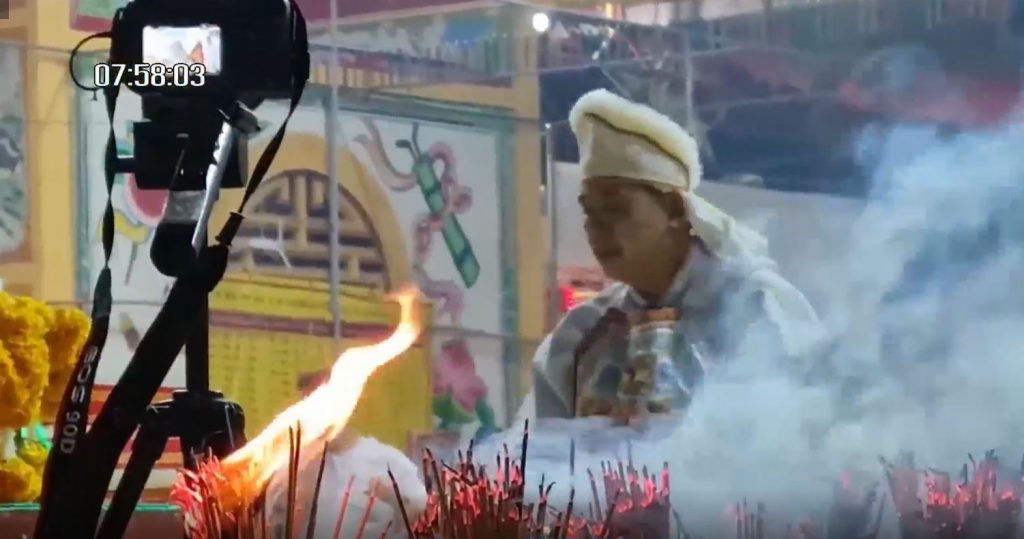 เมื่อเวลา 23.39 น. ที่ผ่านมา ที่ศาลเจ้านาจาซาไท้จื้อเอี๊ยกง ตำบลบ้านปรก อำเภอเมือง จังหวัดสมุทรสงคราม ชาวไทยเชื้อสายจีนแต่งชุดขาวร่วมพิธีเดินธูปรอบๆ ศาล เพื่อถวายเป็นพุทธบูชาและยังเป็นการเสริมสร้างความเป็นสิริมงคลให้กับชีวิต พร้อมทั้งข้ามสะพานศุภมงคลปทีปขึ้นไปขอพรต่อเง็กเซียนฮ่องเต้ซึ่งเป็นเทพเจ้าสูงสุดตามความเชื่อของชาวจีน ที่จะประทานพรให้ผู้เข้าร่วมถือศีลกินเจประสบความสำเร็จ จากนั้นได้ร่วมพิธีเผาหีบมหาสมบัติขององค์เทพเจ้า หรือเซฟสวรรค์ ขนาดกว้าง 3.5 เมตร ยาว 6 เมตร สูง 1.5 เมตร ใหญ่ที่สุดในจังหวัดสมุทรสงคราม โดยด้านหน้าจะเขียนอักษรจีนตัวหกแปลว่าบุญวาสนา และด้านหลังตัวใช้ แปลว่าโชคลาภ และด้านบนทั้ง 2 ด้านจะมีภาษาจีนเขียนว่ากิ๋วฮวงฮุกโจ้ป๋อโค่ว แปลว่าหีบมหาสมบัติของกิ้วฮ้วงฮุกโจ้ว โดยเผาหีบดังกล่าวกลางคลองแม่กลองพร้อมเครื่องบูชาต่างๆเช่นโคมไฟ, ชุดเทพเจ้า, แจกัน, กระดาษเงิน,กระดาษทองนับหมื่นชิ้น รวมมูลค่าเกือบ 1 ล้านบาท และยังจุดประทัดกว่า 1 ล้าน ซึ่งผู้มีจิตศรัทธาร่วมกันถวายส่งเทพเจ้ากิ้วฮ้วงฮุกโจ้ขึ้นสวรรค์ ตามความเชื่อของชาวจีนและชาวไทยเชื้อสายจีน เป็นอันสิ้นสุดเทศกาลถือศีลกินเจประจำปี 2563