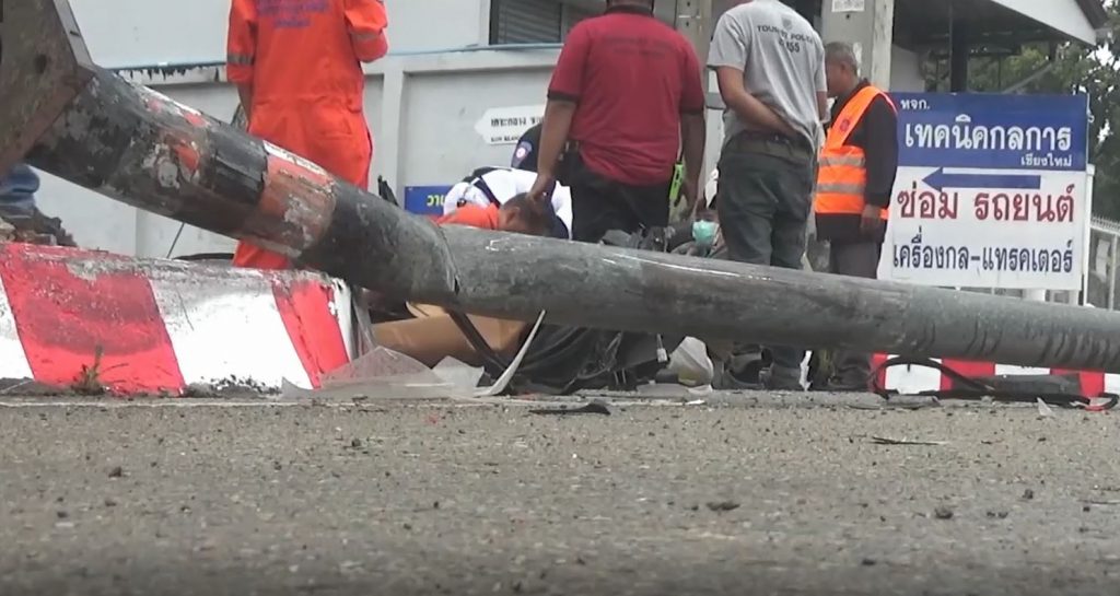 เกิดอุบัติเหตุรถเก๋งสปอร์ตสีดำ ทะเบียนเชียงใหม่ เสียหลักพุ่งชนเสาไฟฟ้าส่องสว่างช่วงทางโค้ง ย่านถนนมหิดลขาออก ไปทางสี่แยกหนองหอย บริเวณปากซอย เกาะกลางซอย 3 ทำให้รถพลิกคว่ำ หงายท้องล้อชี้ฟ้า หลังคายุบ พังยับเยิน นายเอกวีร์ สินธพทอง คนขับเสียชีวิตคาที่ ขณะที่เสาไฟฟ้าหักโค่นขวางถนน