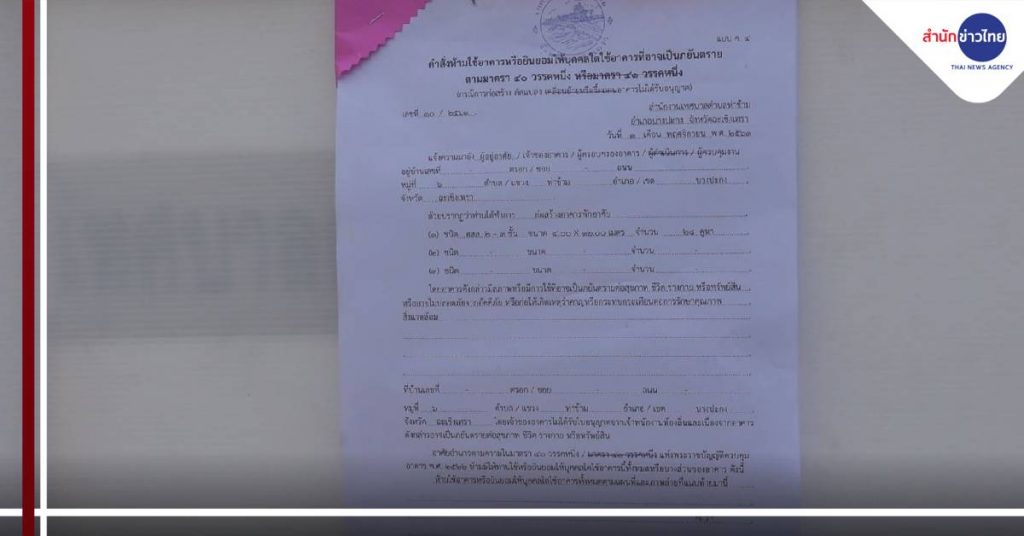 ฉะเชิงเทรา 4 พ.ย.-เจ้าหน้าที่ติดหนังสือระงับการใช้อาคารพาณิชย์สองชั้นอายุกว่า30ปี ในตลาดสดบางแสม ต.ท่าข้าม อ.บางปะกง จ.ฉะเชิงเทรา ที่มีการต่อเติมโดยไม่ได้รับอนุญาต แล้วเกิดการทรุดตัวเพราะคานรับน้ำหนักไม่ไหว