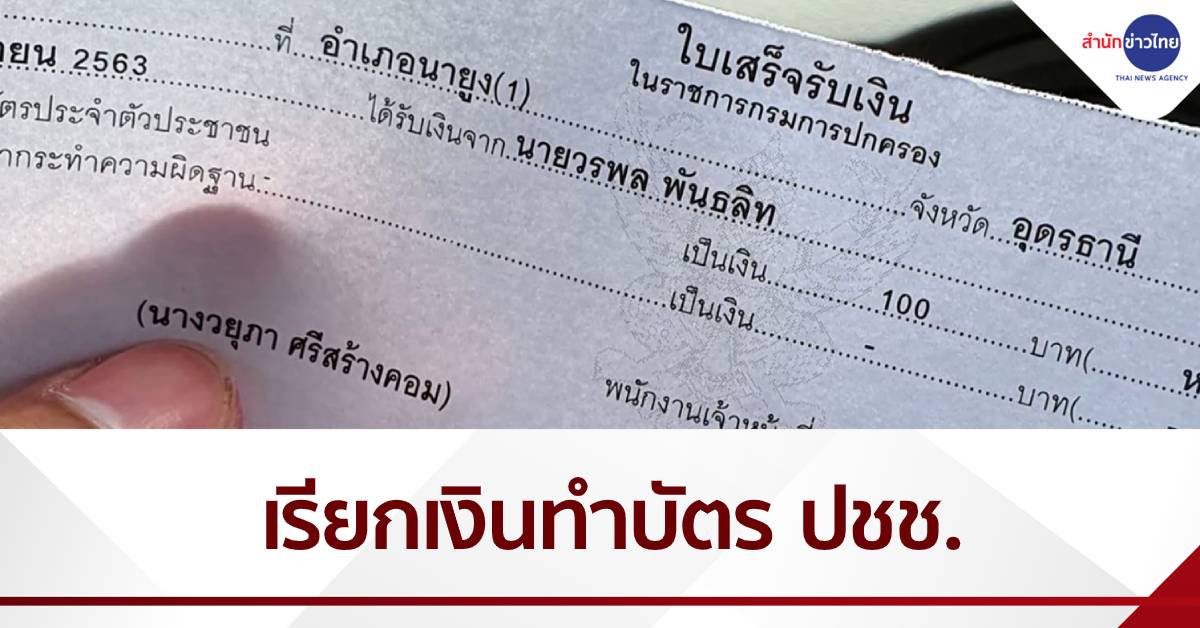 จากกรณีผู้ใช้เฟซบุ๊ก “Tawan Worapol” โพสต์ในหน้าฟีดของตัวเอง ระบุเช็คอินวันที่ 2 พฤศจิกายน เวลา 09.48 น. ที่ว่าการอำเภอนายูง จังหวัดอุดรธานี มีข้อความว่า วันนี้มาถ่ายบัตรใหม่ บัตรเดิมหาย หายที่ไหนช่างมัน ประเด็นคือ ค่าธรรมบัตร เจ้าหน้าที่บอกผม 160 ผม: ผมถามว่า ปกติค่าธรรมเนียม 100 ผมศึกษาข้อมูลมาละ พนักงาน: บอกมันมีค่าธรรมเนียมอย่างอื่น ค่าบริการ ผม: ตอกไปว่า คุณทำงานหน่วยงานของรัฐ คุณยังจะมีค่าบริการอีกหรอ ผมเลยบอก ขอใบเสร็จ ออกใบเสร็จมา เจ้าหน้าที่ : ตอบออกใบเสร็จไม่ได้หรอก ผม: ผมเลยบอกคุณเก็บเพิ่มคนละ 60 บาท ถ้าคนอื่นเขาไม่ได้หนังสือ ไม่มีความรู้ ถ้ามาทำ 100 คน ก็ 6000 นะ
