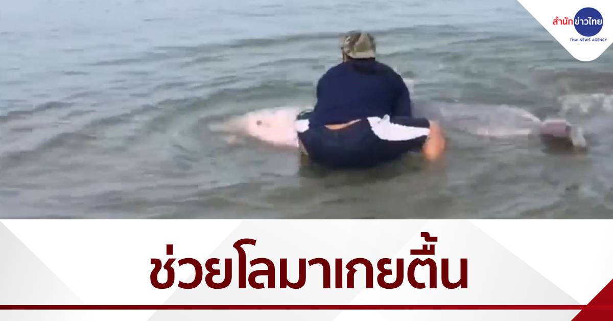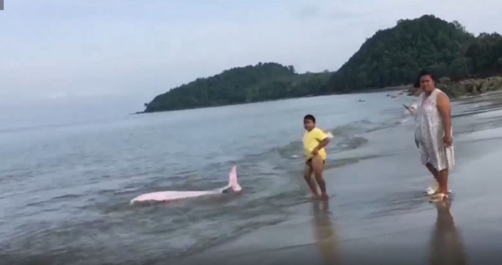 ตรัง 8 พ.ย.-นักท่องเที่ยว ช่วยโลมาปากขวดสีชมพู เกยตื้นอยู่หน้าหาดบนเกาะสุกร ให้กลับลงสู่ทะเล ไปหาโลมาปากขวดอีก 2 ตัว ที่ว่ายรออยู่ในทะเล