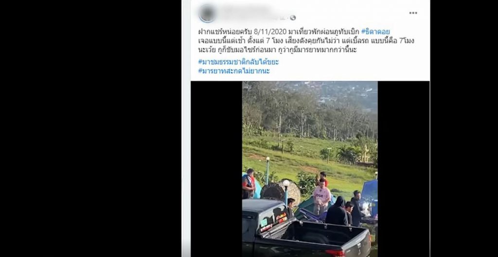 ผู้ใช้เฟซบุ๊ก Walnut Kitsada โพสต์คลิป กลุ่มที่ผู้โพสต์เรียกว่า “กลุ่มขยะ” สร้างทั้งมลพิษและเสียงที่น่ารำคาญแก่นักท่องเที่ยวรายอื่นๆ ซึ่งผู้โพสต์ได้เล่าไว้ในเฟซบุ๊กว่า