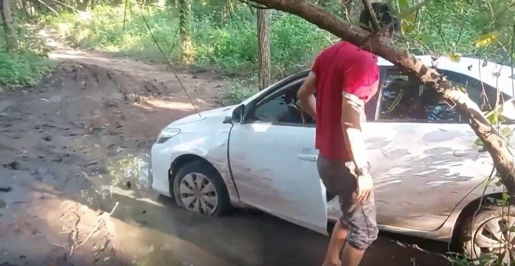 จุดที่พบรถยนต์อยู่ห่างจากทางแยกถนนสายหลักของหมู่บ้าน เป็นถนนลูกรังในช่วงแรก จากนั้นสภาพถนนเป็นเส้นทางภูมิประเทศที่ชาวบ้านใช้สัญจรหาของป่า บางช่วงเป็นร่องลึก ดินเลนน้ำขังแฉะ ต้องจอดรถและใช้มีดฟันต้นไม้เปิดทางและต้องข้ามลำห้วย ถึง 2 แห่ง กว่าจะถึงจุดเกิดเหตุ รวมระยะทางประมาณ 5 กิโลเมตร พบนายบันลือฤทธิ์ เวียงทอง อายุ 34 ปี ชาว อ.ป่าซาง จ.ลำพูน ยืนรอความช่วยเหลือ มีรถยนต์เก๋งยี่ห้อ โตโยต้า สีขาว ทะเบียนเชียงใหม่ จอดอยู่ในลำห้วย ล้อจมดินโคลน ขยับไม่ได้ เจ้าหน้าที่จึงช่วยชักลากขึ้นมา แล้วพาย้อนกลับตามเส้นทางเดิมออกมาอย่างปลอดภัย