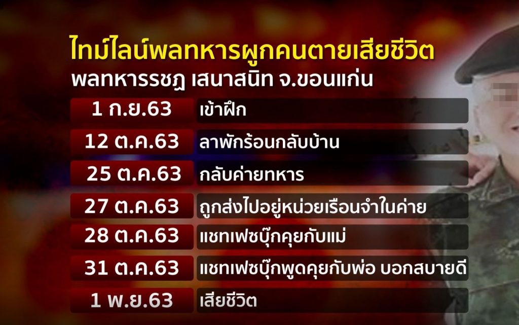 เช่นเดียวกับพ่อพลทหารก็ไม่เชื่อลูกชายฆ่าตัวตายเช่นกัน โดยบอกว่าลูกชายสมัครเป็นทหารที่ค่ายทหารแห่งหนึ่งใน อ.เมือง จ.ขอนแก่น และเข้าฝึกวันที่ 1 ก.ย. จากนั้นวันที่ 12 ต.ค.63 ได้ลาพักกลับบ้าน และกลับไปค่ายวันที่ 25 ต.ค. ก่อนจะถูกส่งไปอยู่หน่วยเรือนจำในค่ายเมื่อวันที่ 27 ต.ค. ระหว่างนั้นยังได้ทักแชทเฟซบุ๊กคุยกัน บอกว่าสบายดี ทำงานส่งเอกสารกับรับส่งกุญแจ แต่ปรากฏว่า วันที่ 1 พ.ย. กลับได้รับแจ้งว่าบุตรชายผูกคอตาย ทั้งที่ลูกชายมีนิสัยขี้กลัว และวันนี้จะไปพบพนักงานสอบสวน ที่ สภ.ย่อยศิลา เพื่อติดตามทวงความยุติธรรมให้กับลูกชาย.-สำนักข่าวไทย